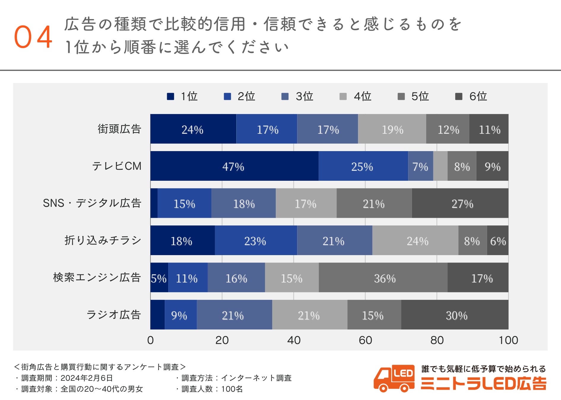 ランキング形式で伺ったところ、47%の方が「テレビCM」を信頼できる広告と考えていることがわかりました。
