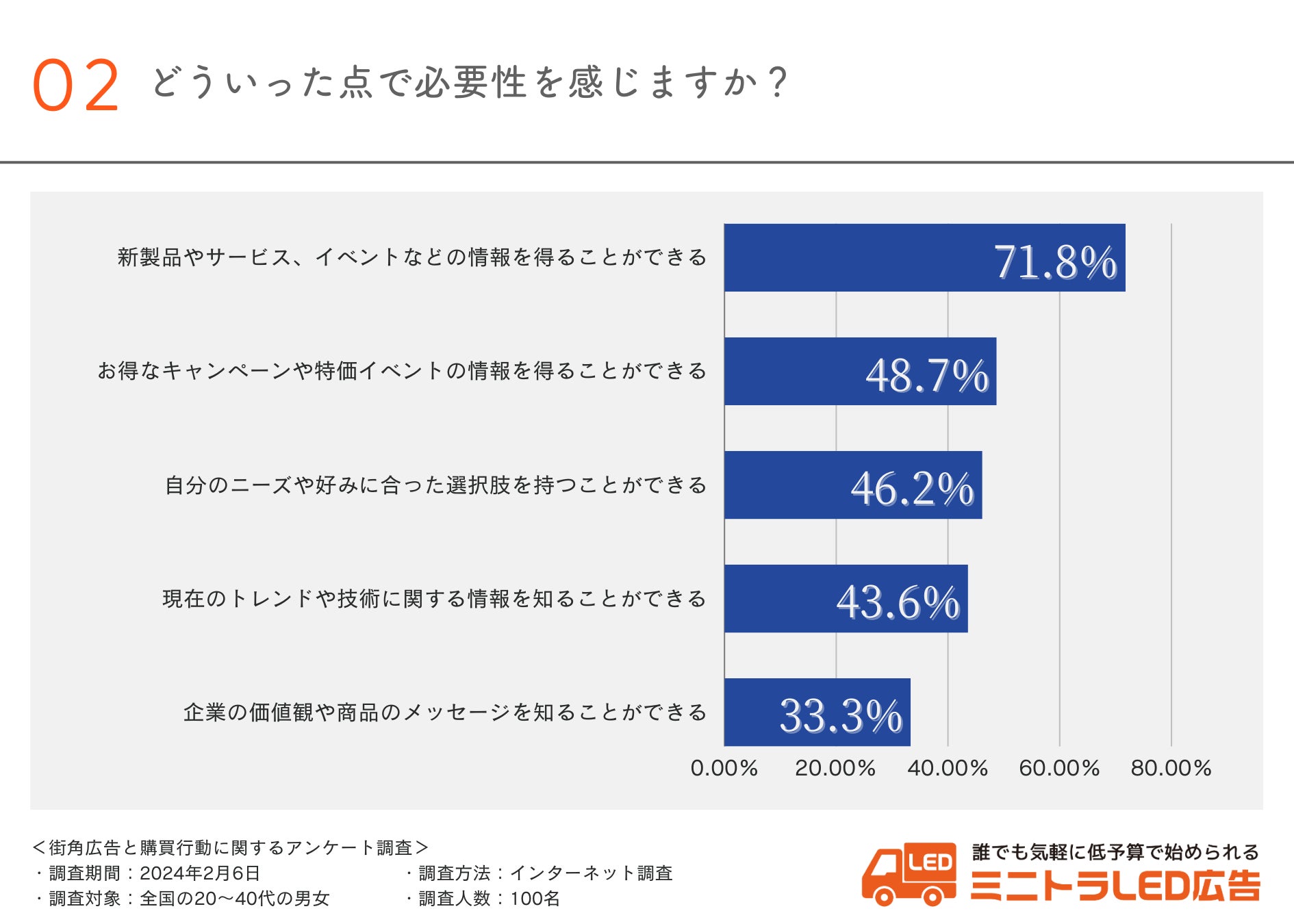 広告の必要性を感じている層に対して、どういった点で必要性を感じているか伺ったところ、「新製品やサービス、イベントなどの情報を得ることができる(71.8%)」と回答した方が最も多い結果となりました。