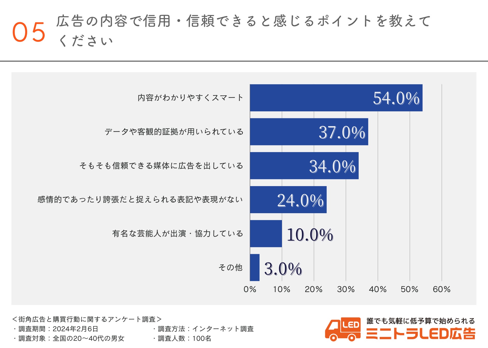 次に、広告の内容で信用・信頼できると感じるポイントについて伺ったところ、「内容がわかりやすくスマート(54.0%)」「データや客観的証拠が用いられている(37.0%)」という回答が上位に挙げられました。