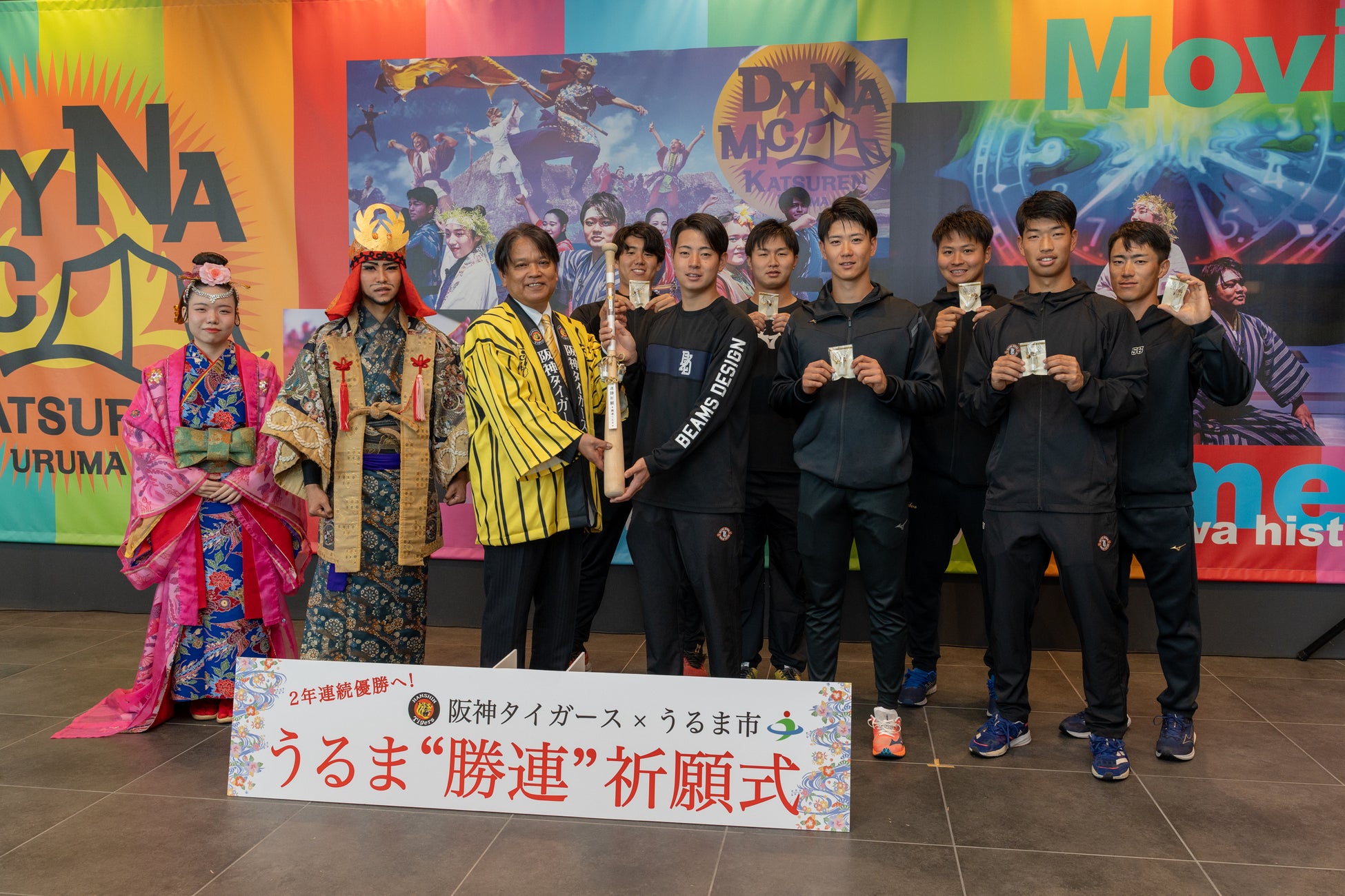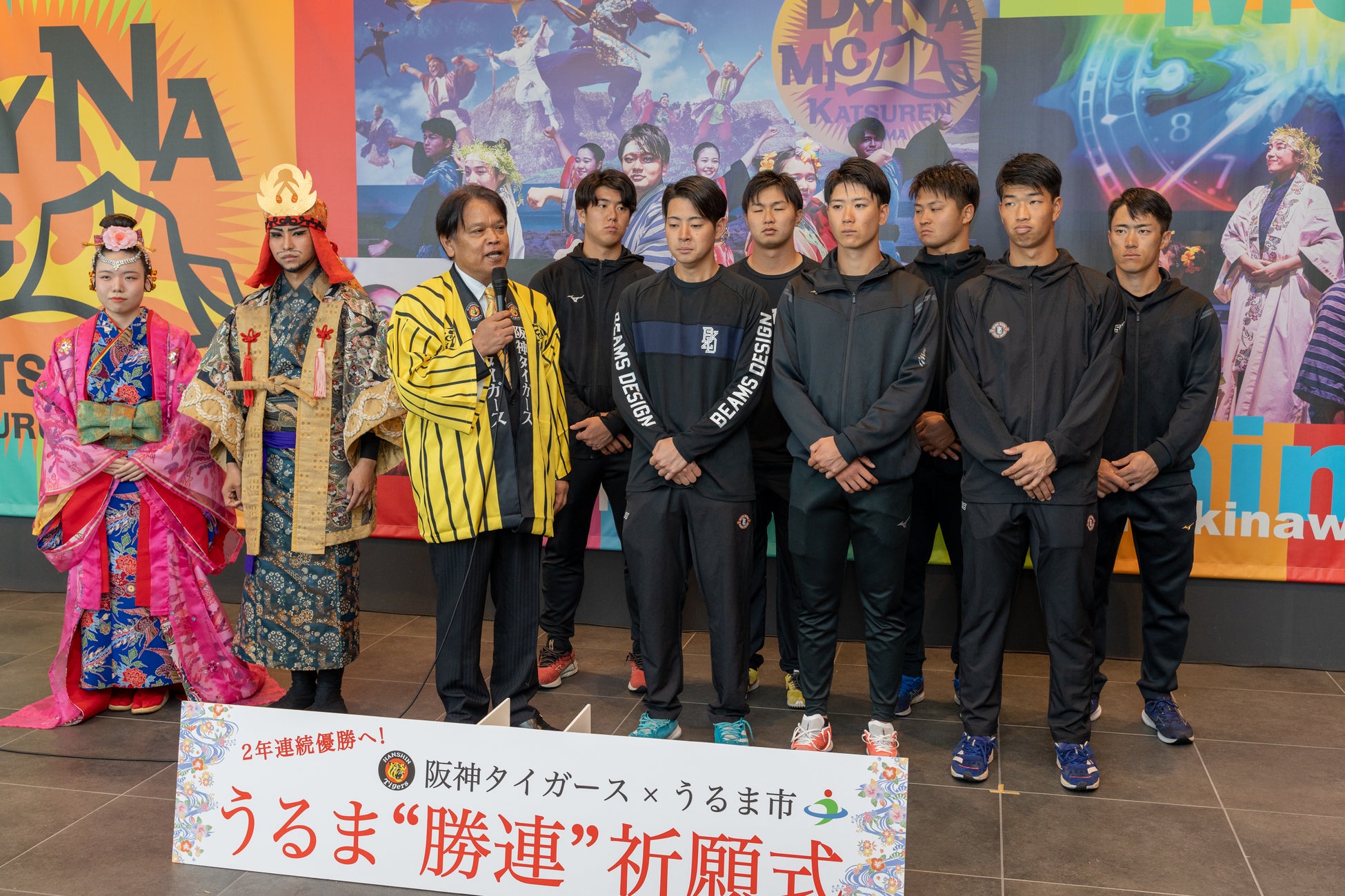 2024年2月9日、沖縄県うるま市では、同市で春季キャンプ中の阪神タイガースの2年連続優勝を願い、中村正人市長並びに現代版組踊「肝高の阿麻和利」の阿麻和利と百十踏揚、そして阪神タイガース阪神タイガースの新入団選手よりファームキャンプ参加中の7名の選手出席のもと、うるま“勝連”祈願式を実施いたしました。
