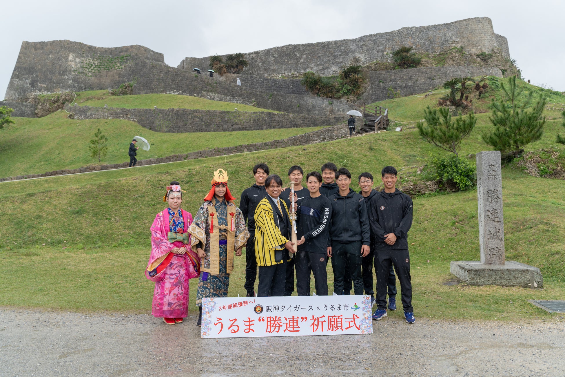阪神タイガース新人選手の皆様、本日はうるま市の世界遺産「勝連城跡」へお越しいただきありがとうございます。そして、阪神タイガースへの入団誠におめでとうございます。本日はあいにくの雨ではありましたが、雨降って地固まるともいいますので、本日の祈願式がよい結果、チームの連覇につながればと願っております。