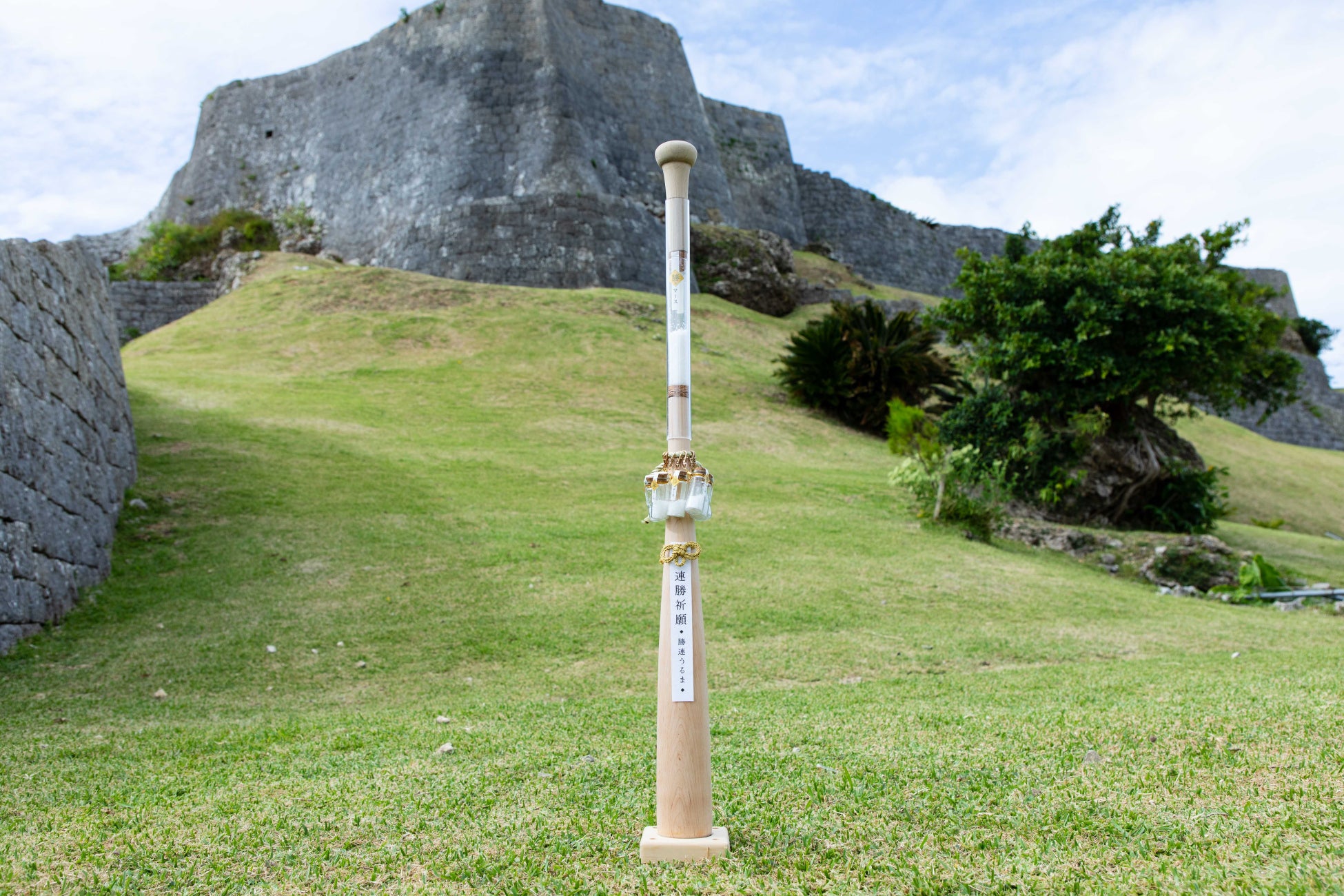 「神々の住む島」と言われている浜比嘉島のマース(塩)を封入し、勝連の「勝ちが連なる」にちなみ、スポーツや受験などに「勝つ」。逆境や病気や苦難に「打ち勝つ」などの人生の様々な物事に「勝ち続ける」事を祈願するお守りです。野球を象徴するバット型のお守りをうるまで制作し、現代版組踊の阿麻和利、百十踏場によって、勝連城にて、阪神タイガース2年連続優勝祈願の念を込めさせていただきました。