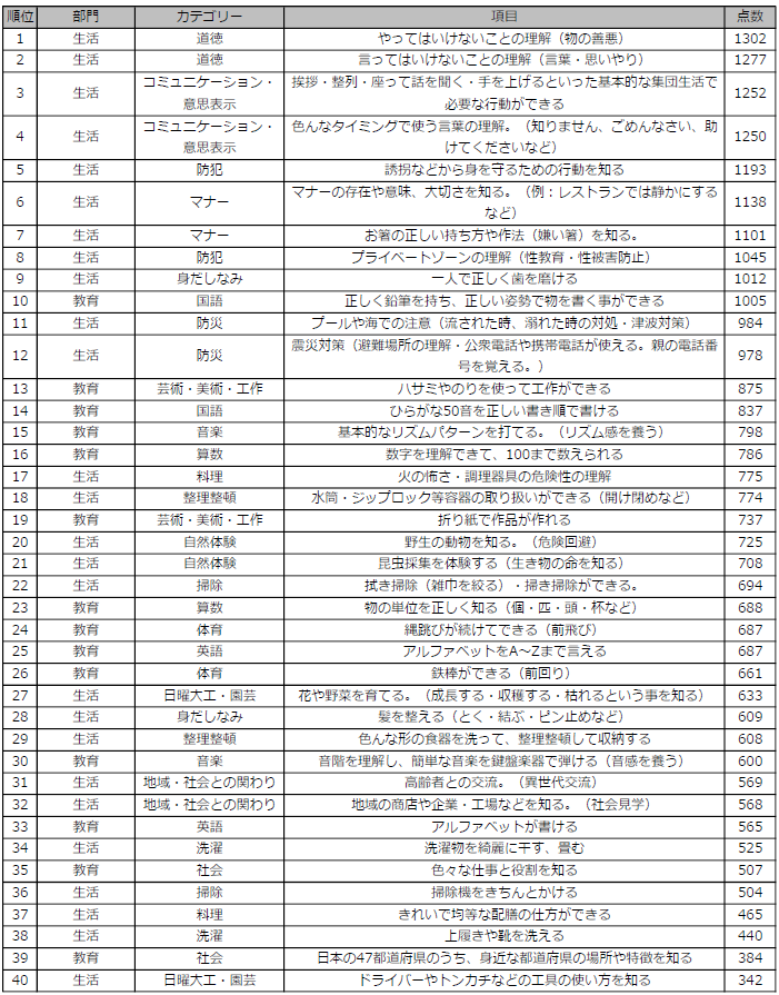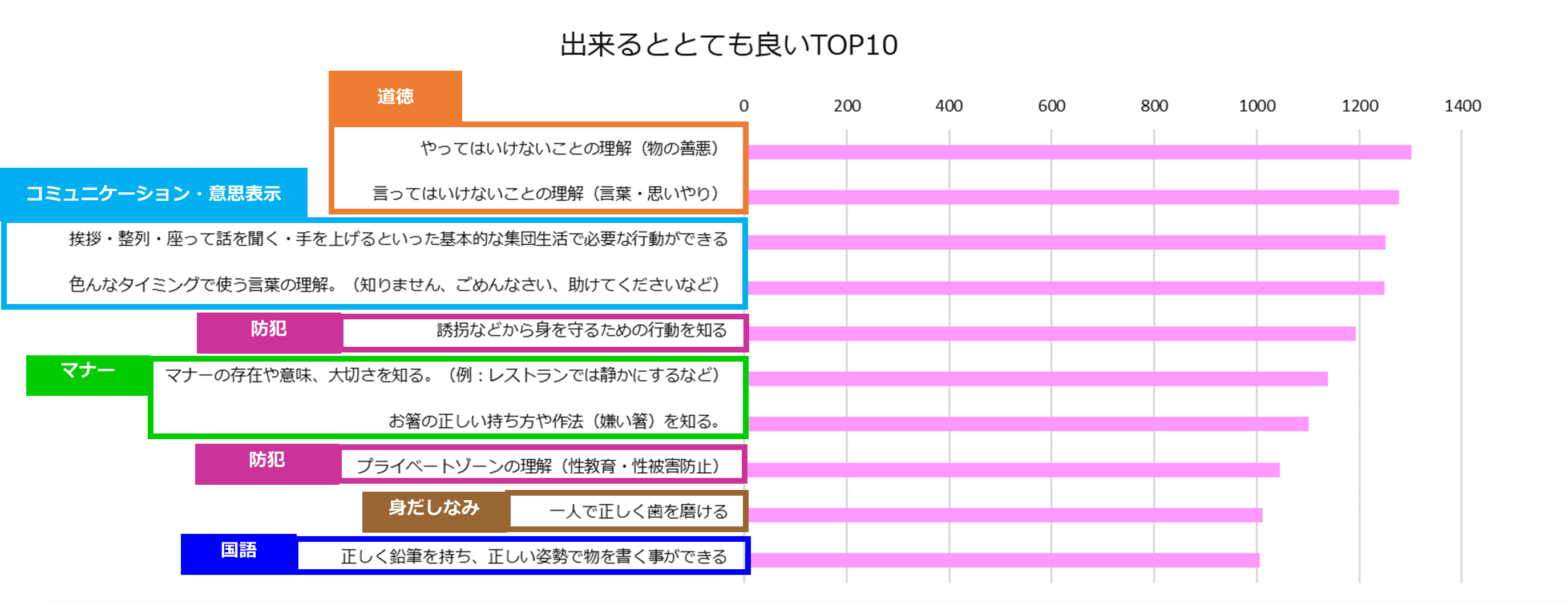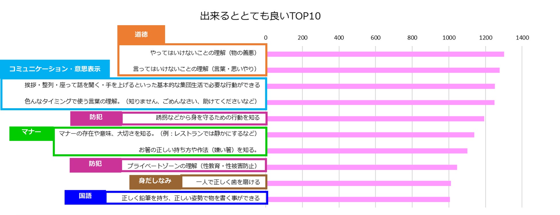 出来て欲しいことTOP10は下記のようになりました。部門としては10位だけが「教育部門」で、9位までは全て「生活部門」となりました。カテゴリーでは、「道徳」(1位、2位)、「コミュニケーション・意思表示」(3位、4位)、「防犯」(5位)が上位でした。