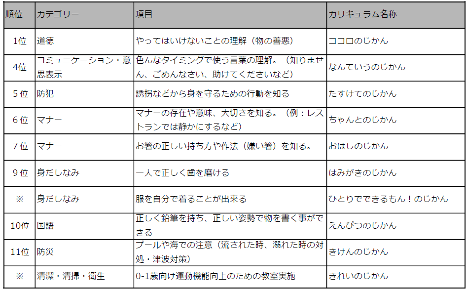 この結果を踏まえ、小学校にあがるまでに出来ていて欲しい上位項目についてお子さまのサポートを行う10のカリキュラムを新設し、都市型/認可保育園「ポポラー」及び事業所内保育所「プロペラ」にて、2024年4月から実施します。