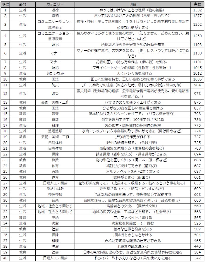 このアンケートでは、お子さまが”小学校にあがるまでに出来ていて欲しい事”、すでに就学されているお子さまに関しては、”出来ていれば良かったな”と思われる事について、教育部門で14項目(7カテゴリー各2項目)、生活部門で26項目(13カテゴリー各2項目)、計40項目で「出来るととても良い」「出来た方が良い」「どちらでもない(分からない)」「出来なくて良い」のいずれかを選択していただきました。
