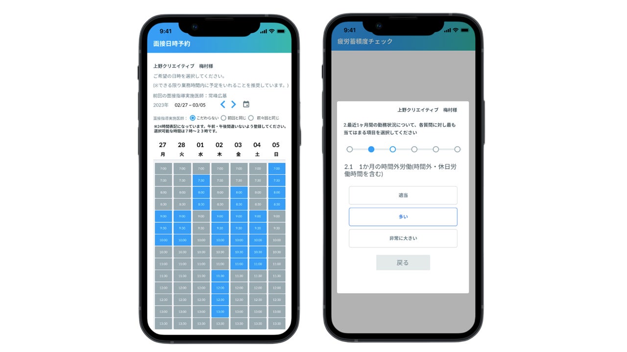 「面接おまかせくん」🄬は、面接指導の対象となった医師がスマホで問診への回答、面接日時の予約ができます。夜間や自分が休みの日でも、オンラインの面接指導が可能となっているため、日中は忙しい医師も面接指導を受けやすくなっています。
