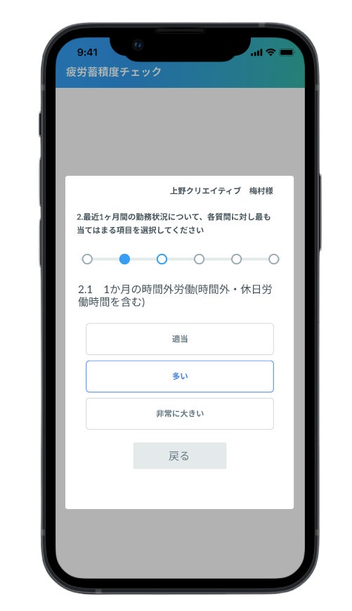 ◀スマホ上であらかじめ回答する問診の画面例。睡眠時間や労働時間、生活状況についての質問に答える。
