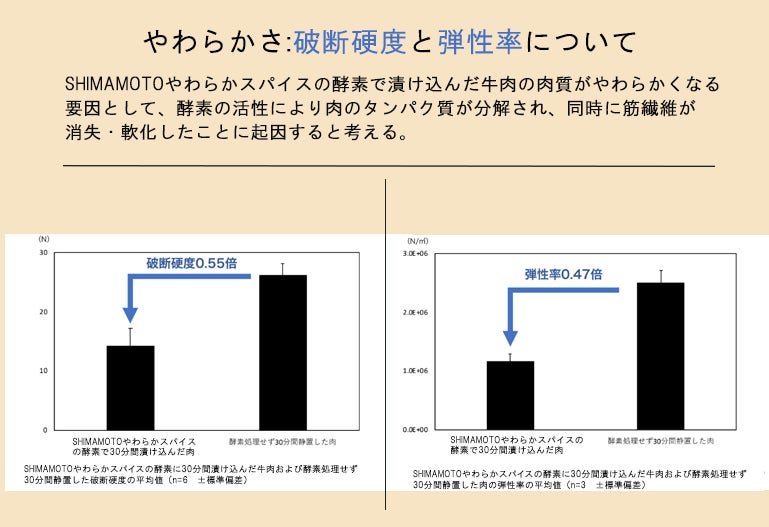 「SHIMAMOTOやわらかスパイス」の酵素をふりかけた牛肉の方が、グルタミン酸が増えたことで、うまみ成分が増加し、弾性率が0.47倍、破断硬度が0.55倍低下したことで、柔らかくなったことが第三者機関にて証明されました。