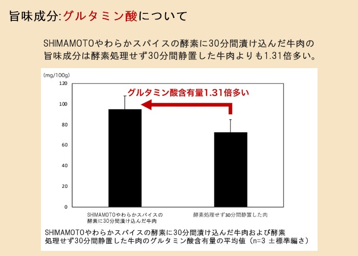 第三者機関の検査でも、旨味成分グルタミン酸が、「SHIMAMOTOやわらかスパイス」の酵素をふりかけて30分間放置した牛肉の方が、通常の牛肉よりも1.31倍多い結果となりました。