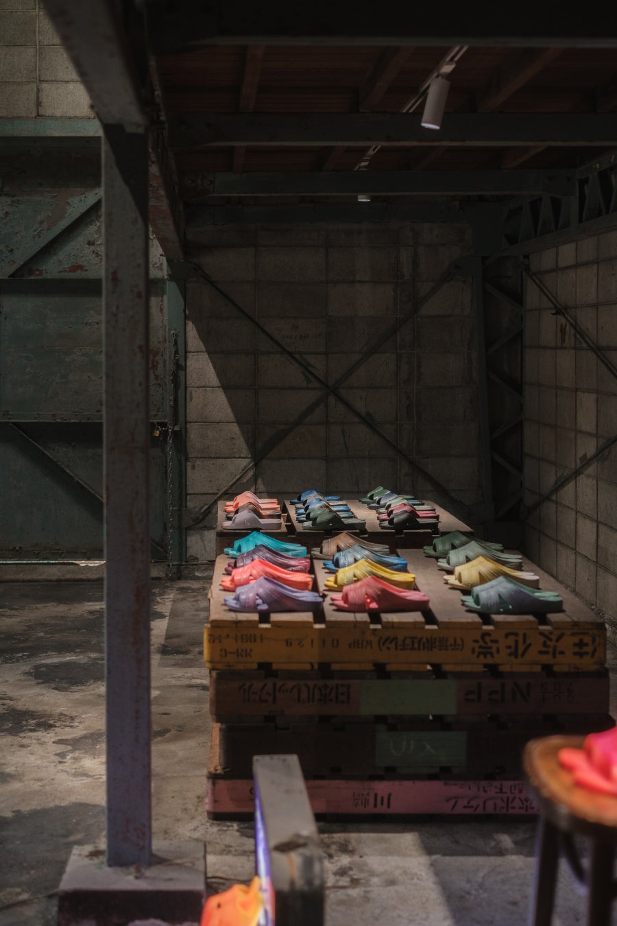 当社施設「ヘップランド」内では、サンダルの試着やものづくりの背景などを感じて頂きながら、ゆったりとお過ごしいただくことも目的の一つです。地元奈良のクラフトビール他、ソフトドリンクなどを準備してお待ちしております。さらに、県内で製造された一体成型サンダル(通称ギョサン、ベンサン)なども展示中です。ぜひ手に取ってご覧ください。