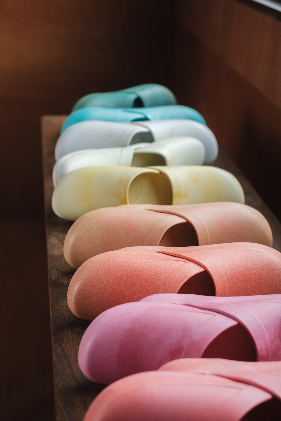 ベンサンやギョサンとして親しまれている一体成型サンダル。製造工程上、色のロットを変更する際に流し込んだ樹脂で押し出す必要があり、その際に発生する色が混ざり合ったマーブル模様のサンダルはスクラップされていました。