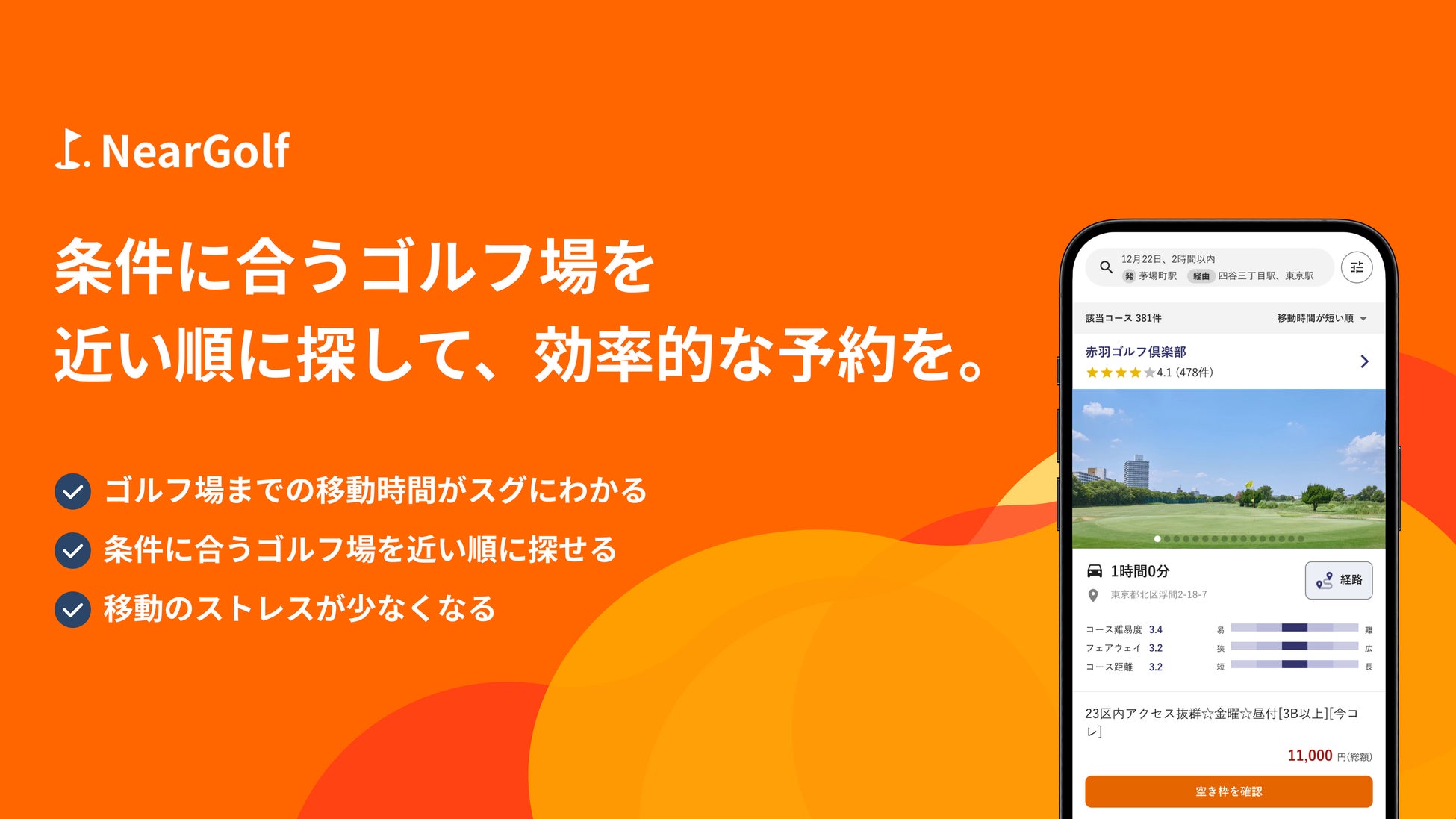 NearGolfは、条件に合うゴルフ場を近い順に探せるゴルフ場予約サイトです。近い順に探せるため、条件に合うできるだけ近いゴルフ場を効率的に予約できます。