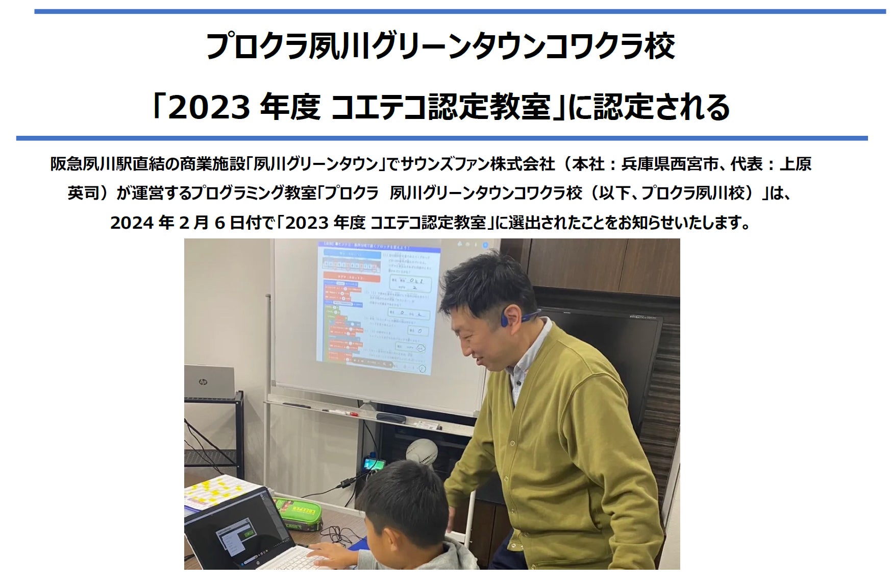 プロクラ夙川グリーンタウンコワクラ校「2023年度 コエテコ認定教室」に認定される