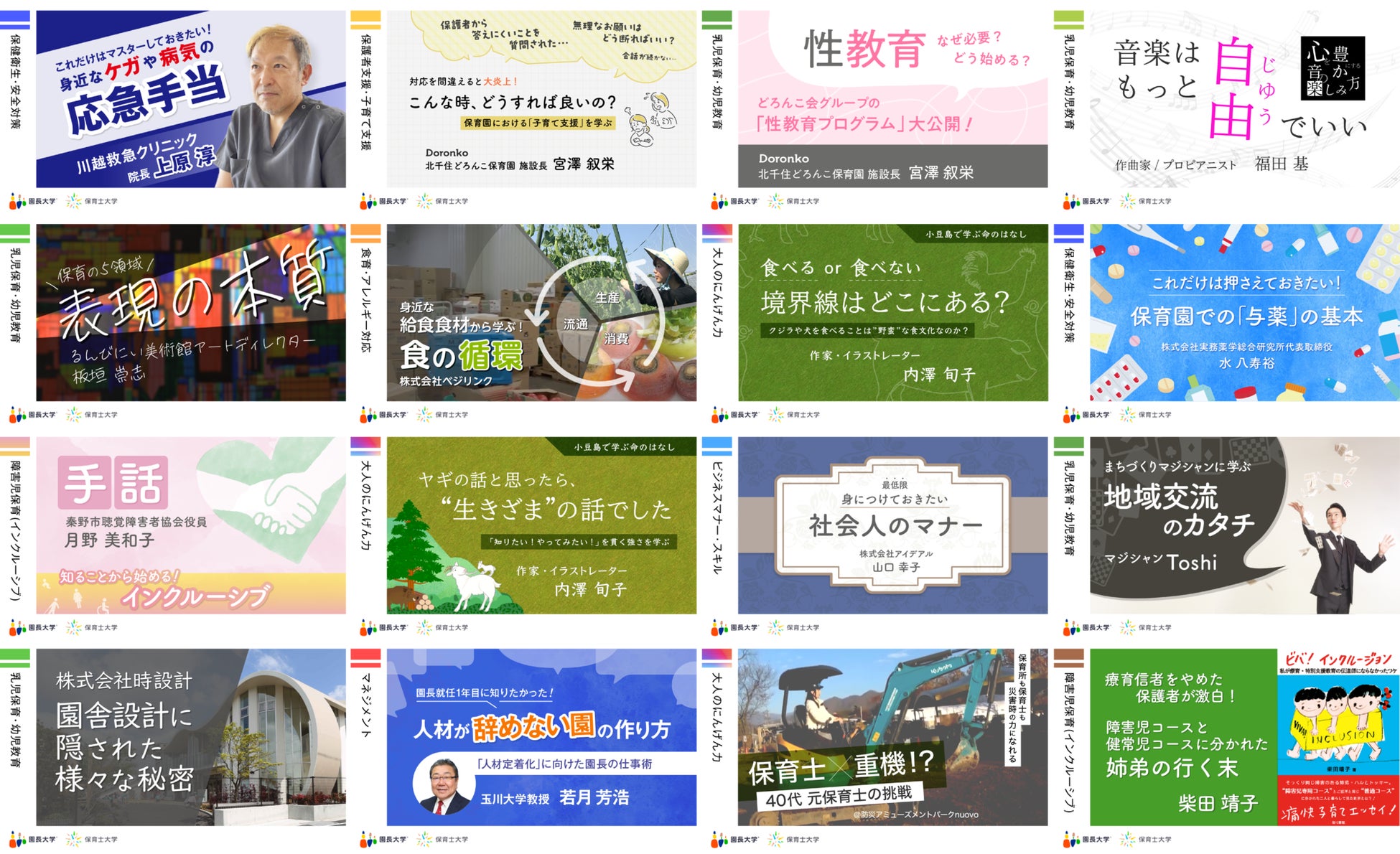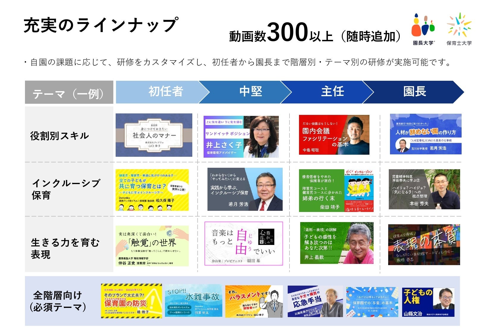 認可保育園、院内・事業所内保育所、認定こども園など全国での運営経験をもち、現場を知り尽くした運営事業者ならではのユニークな講座が満載。インクルーシブ保育、性教育、食育、園内会議、採用、危機管理、人間関係、アウトドア、お金の知識、撮影テクニックなど、さまざまなジャンルの300本以上の動画コンテンツをいつでも、どこでも、誰とでも学び合うことができます。
