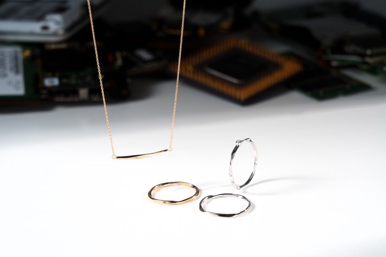 そこで私たちは、「使用済みの小型家電」が都市鉱山として十分な価値があることを表現しつつ、そこから抽出した金を錬成して、しなやかで強く美しいK18ジュエリーとして再生しました。