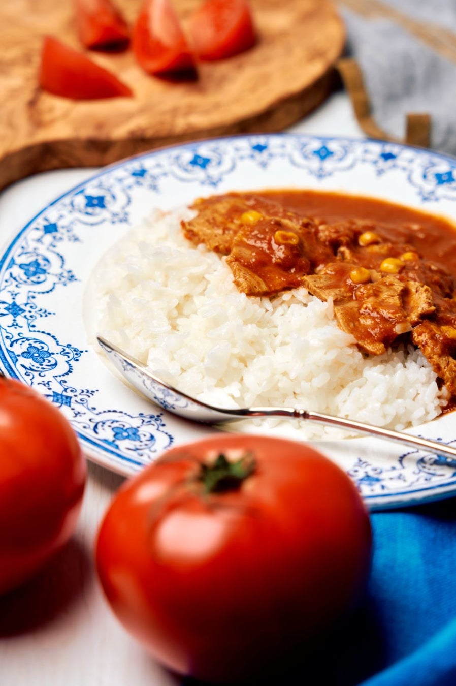 トマトの酸味とほのかに感じるスパイスの風味が口から鼻へ駆け抜け、具材のコーンと玉ねぎ、大豆ミートがアクセントになり食べ応えの抜群なトマトカレーです。特定7品目不使用(卵、乳、小麦、えび、かに、落花生、そば)のグルテンフリーカレーのため、子供から大人までたくさんの方に味わっていただけます。
