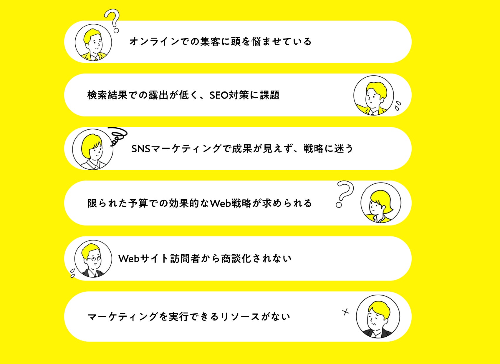 WebStratは、Webマーケティングをさらに強化したい中小企業の経営者、スタートアップの創業者、地域密着型ビジネスのオーナー、オンラインショップの運営者を主な対象としています。以下のようなお悩みはございませんか?