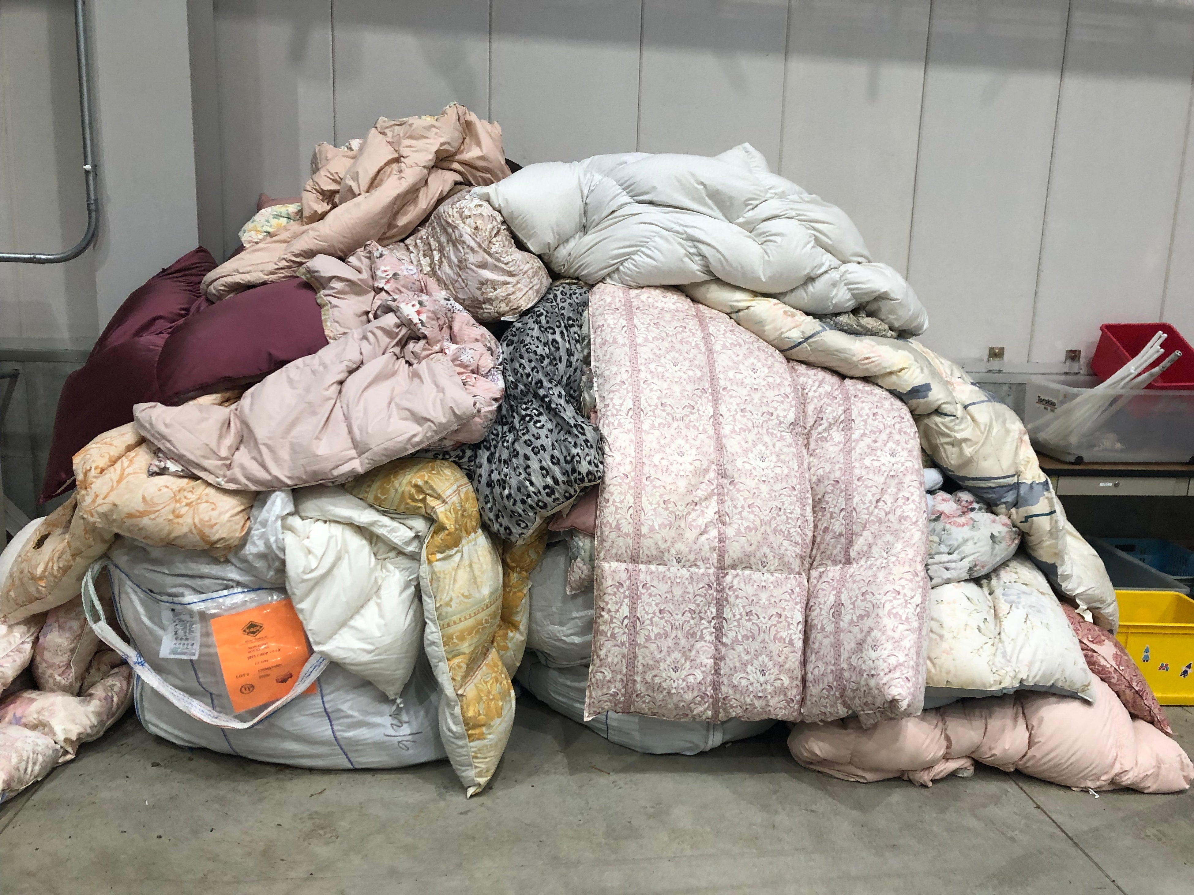 現在、羽毛製品は日本国内において非常に広く普及しました。しかしながら、どのような製品にも、耐久年数=寿命があり、永久に使い続けることは現実的ではありません。一般的には羽毛布団の寿命は10~15年と言われており、寿命が尽きた羽毛布団の多くは粗大ゴミとして家庭から排出され、自治体によって回収され、廃棄物として処理されています。粗大ゴミとして回収された羽毛布団の多くが焼却処分されています。下の画像は、七尾市内のゴミ焼却施設で撮らせて頂いた廃棄される羽毛ふとんの様子。人口減少により廃棄される羽毛ふとんは年々増加しているそうです。