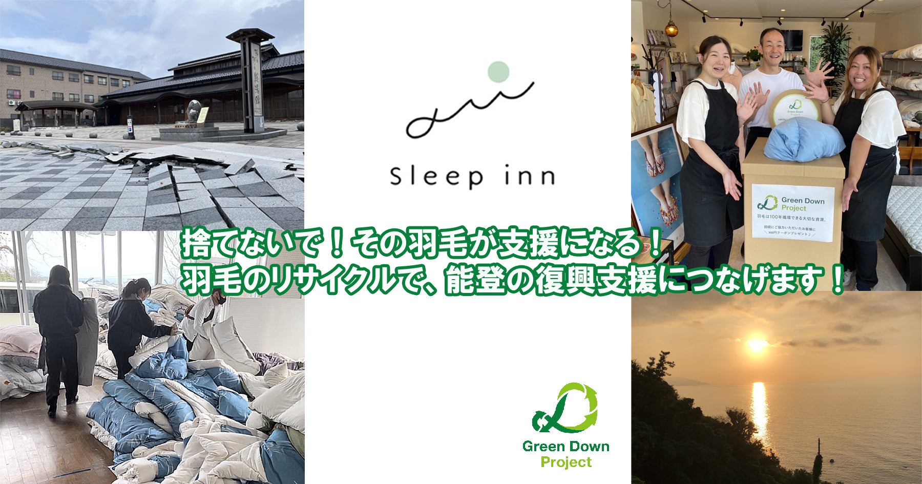 七尾市の寝具店スリープインは、Green Down Projectを通して不要になった羽毛製品のリサイクルで得られる買取金額を義捐金として、能登半島地震で被害を受けた和倉温泉観光協会へ寄付します。
