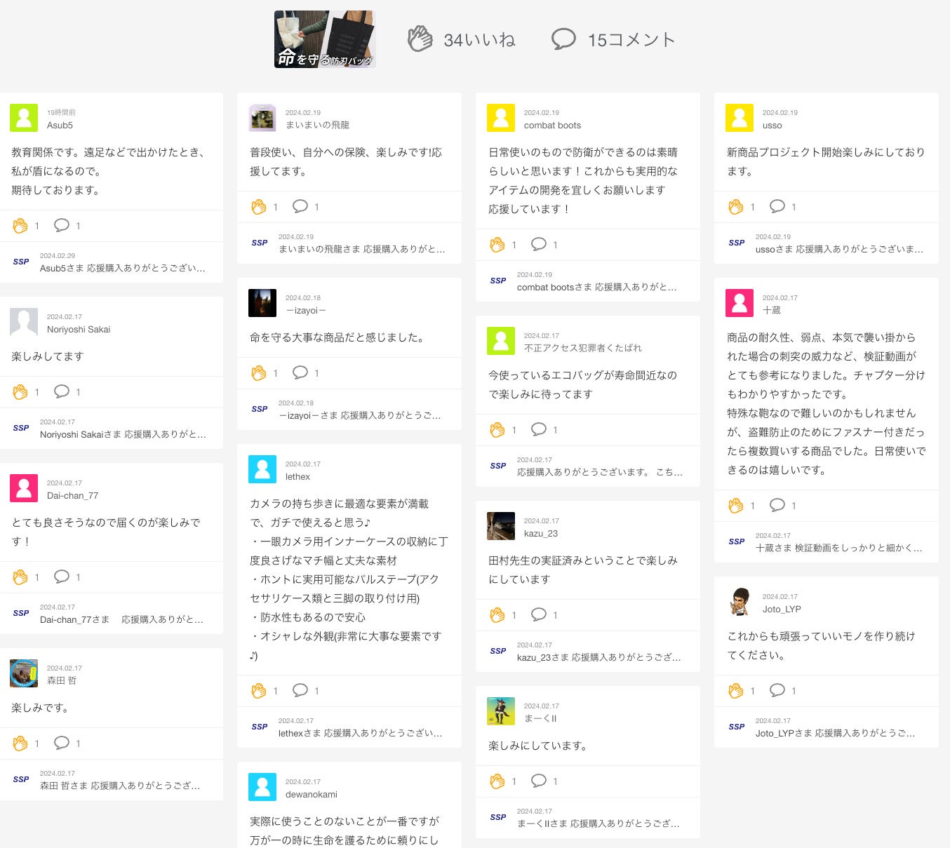 SSPトートは無差別殺傷などの凶悪な事件に不安を感じる現代において「毎日防刃ベストを着込むなんて出来ないが、普段から持ち歩けていざという時に盾となってくれる商品がつくれないか?」というコンセプトで開発され、プロジェクト開始後2週間で370万円を超える支援があり、多くの応援購入ユーザーのお声もいただいております。
