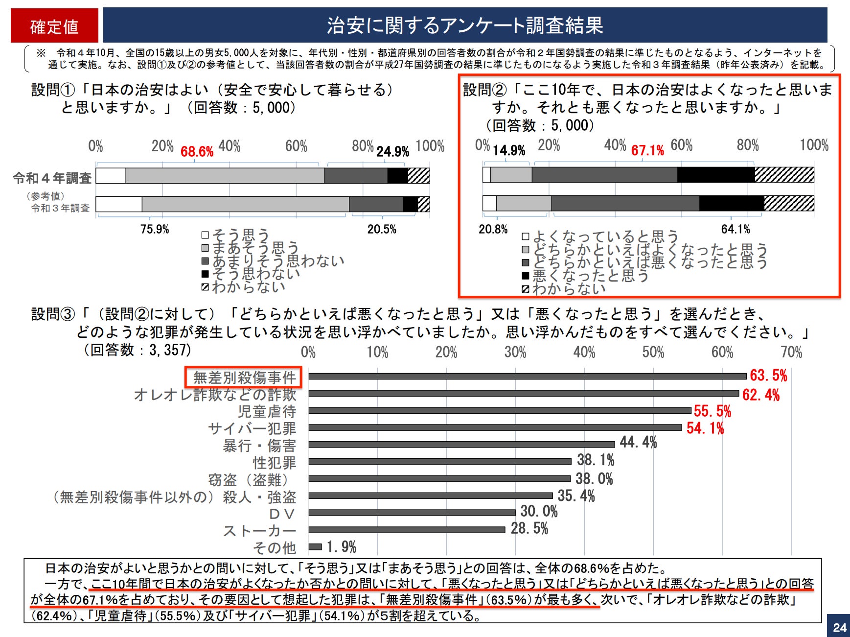 2022年10月に警察庁において5,000人を対象に行われた「治安に関するアンケート調査」では、ここ 10 年間での日本の治安に関し、「悪くなった」「どちらかといえば悪くなった」旨回答した人は全体の 67.1%を占め、その要因として想起する犯罪について「無差別殺傷事件」が63.5%と最も多く回答が寄せられています。