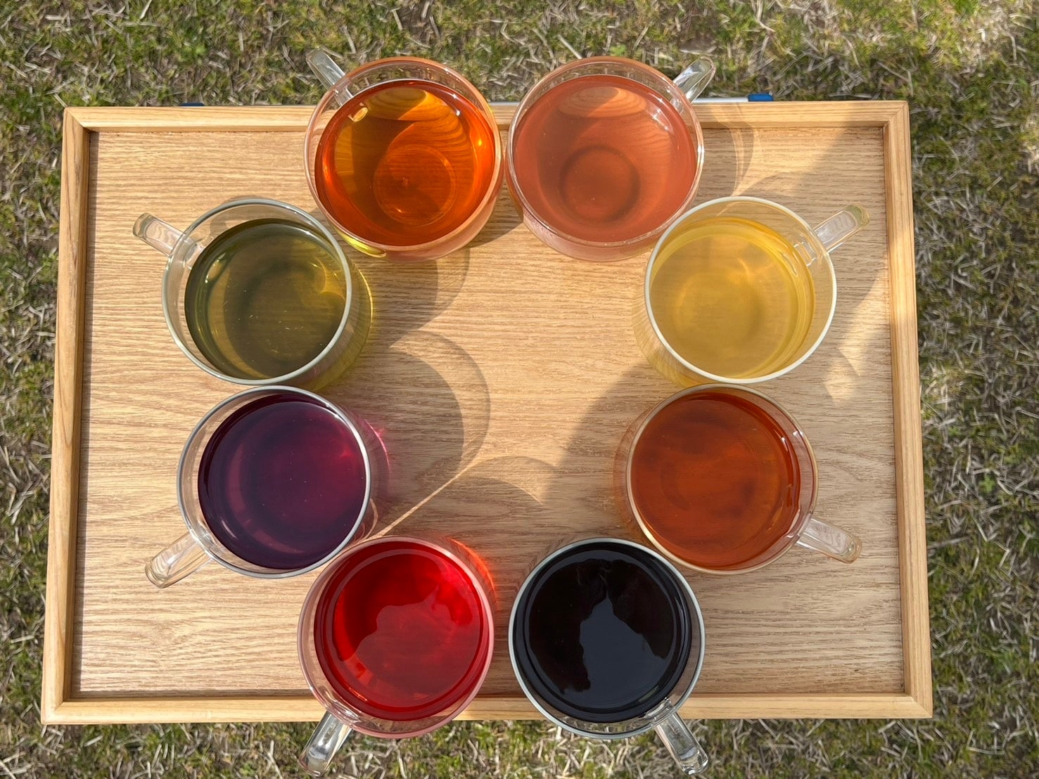 その理由は、ブレンドする茶葉が関係していると考えます。白井製茶のある岐阜県で生産される茶葉は、細かい深蒸し茶でもなく、パキッとした浅蒸し茶でもありません。まさにその中間に位置する「中蒸し茶」です。緑茶単体の水色は、薄緑がかった黄金色。この色が、カラフルな発色をするハーブと相性が抜群でした。発色を邪魔することなく緑茶の味を感じることができる。これができるのは、美濃いび茶ならではの味と水色だからだと確信しています。