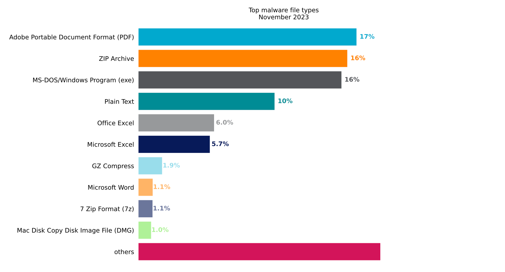 TA866は最新のキャンペーンにおいて、北米のターゲットに向け、PDFドキュメントが添付され、被害者のファイル開封を誘う件名が記された数千通もの電子メールを送付しました。PDFファイルはマルウェアで多く用いられるファイルタイプランキングで < https://www.netskope.com/jp/blog/netskope-threat-labs-stats-for-november-2023 > 上位を保っており、今回のキャンペーンも例外ではありません。キャンペーンで用いられるPDFにはOneDriveのURLが含まれており、これをクリックすると多段階感染が引き起こされ、攻撃者によって武器化されたスクリーンショット撮影ユーティリティであるScreenshotterマルウェアのペイロードがドロッパーを介してインストールされる事態を招きます。