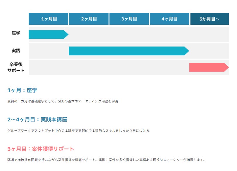 実践で通用するスキルや知識を身に付けていただくためのこだわりのカリキュラムと、案件獲得までの徹底したサポート体制で、卒業後のWEBマーケターデビューを強力にバックアップできるのが魅力です。