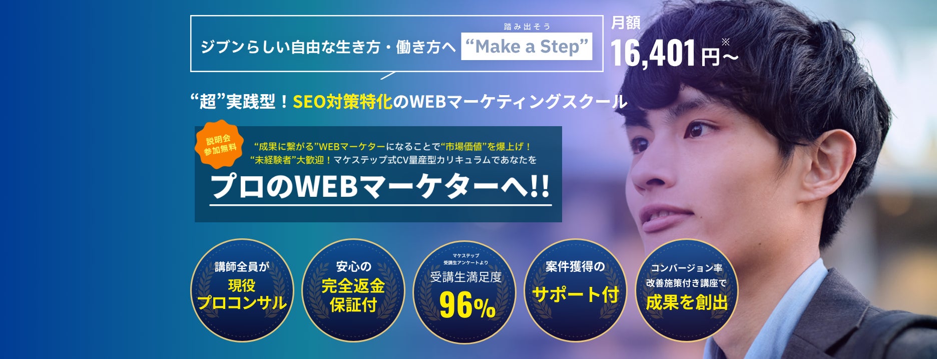 「マケステップ」は、業界未経験から「クライアントの売上に真に貢献するSEOマーケター」を目指す方のためのWEBマーケティングスクールです。