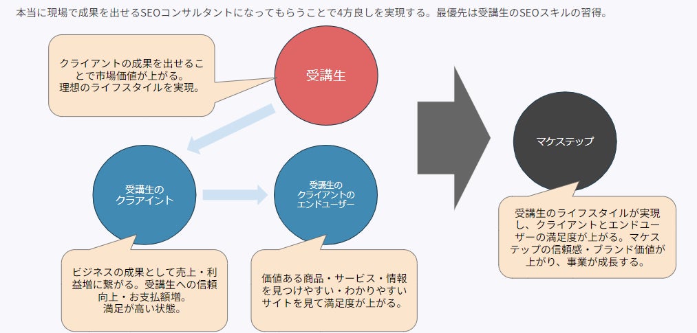 こうした背景から、クライアントの成果に真に貢献できるSEOマーケターを育成するための“超”実践型WEBマーケティングスクール「マケステップ」立ち上げに至りました。