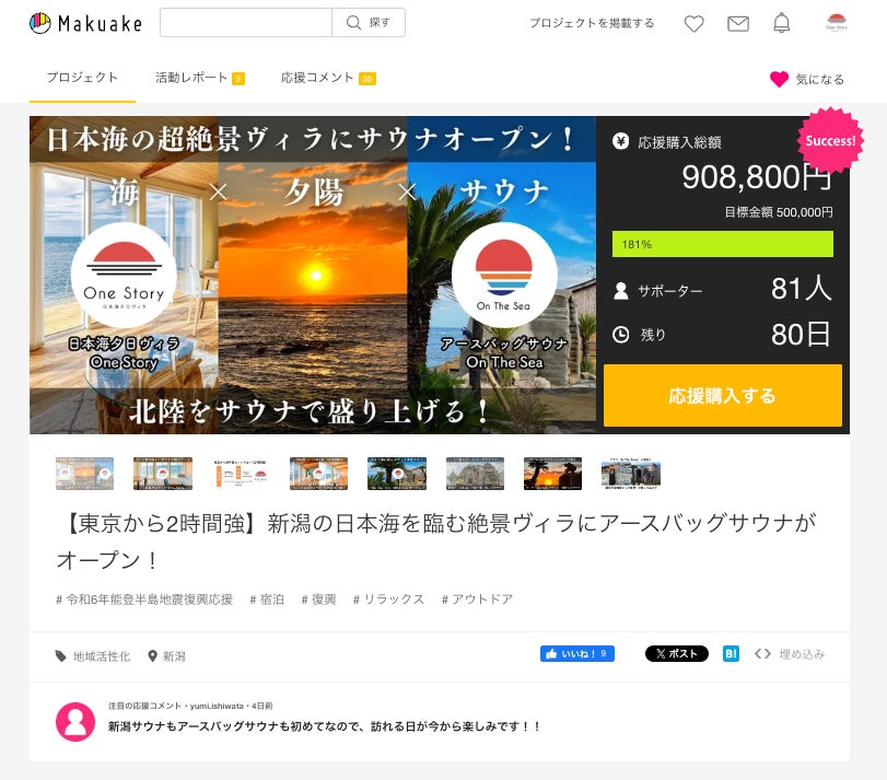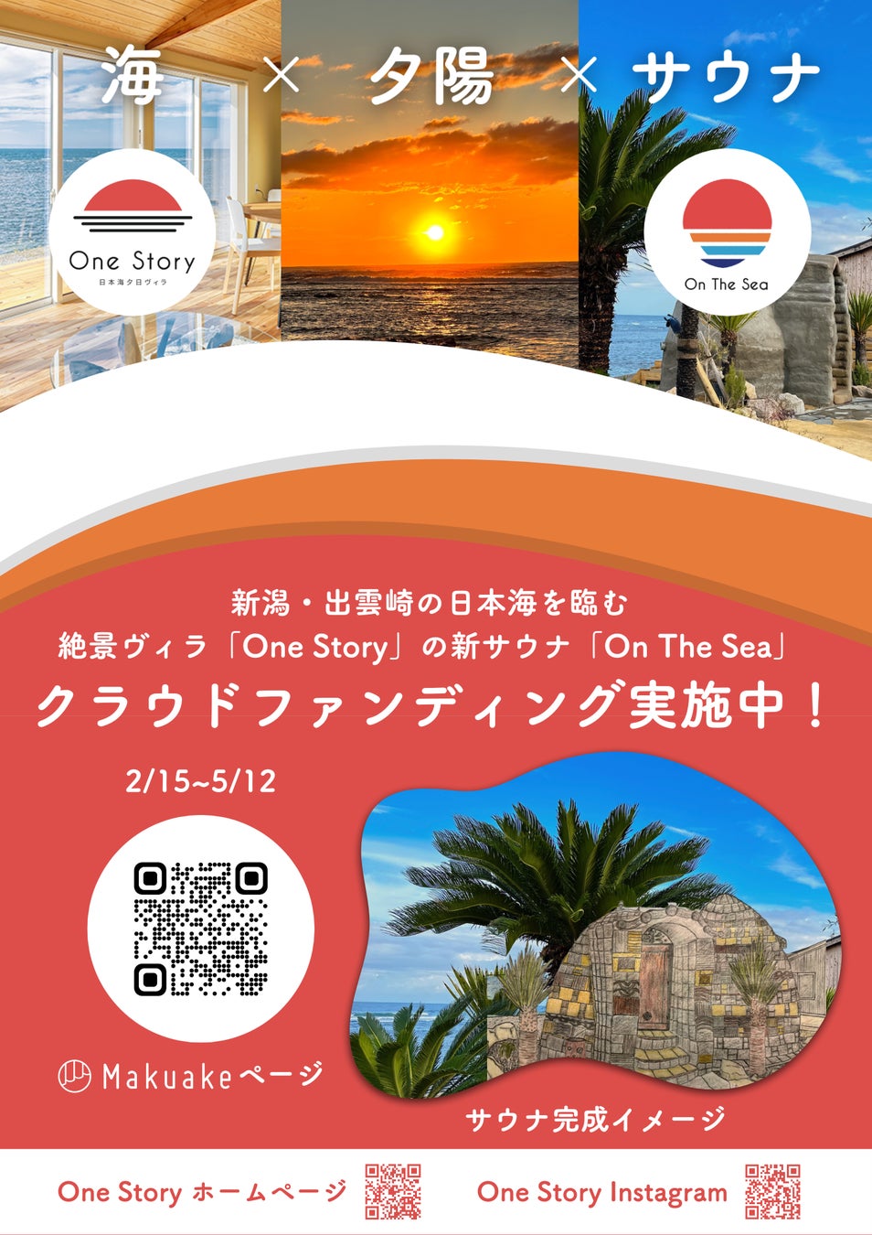 【6月1日新サウナOPEN】新潟・出雲崎町の日本海を臨む絶景ヴィラ「One Story」併設の新アースバッグサウナ「On The Sea」のMakuakeプロジェクト、公開1日で目標金額達成!