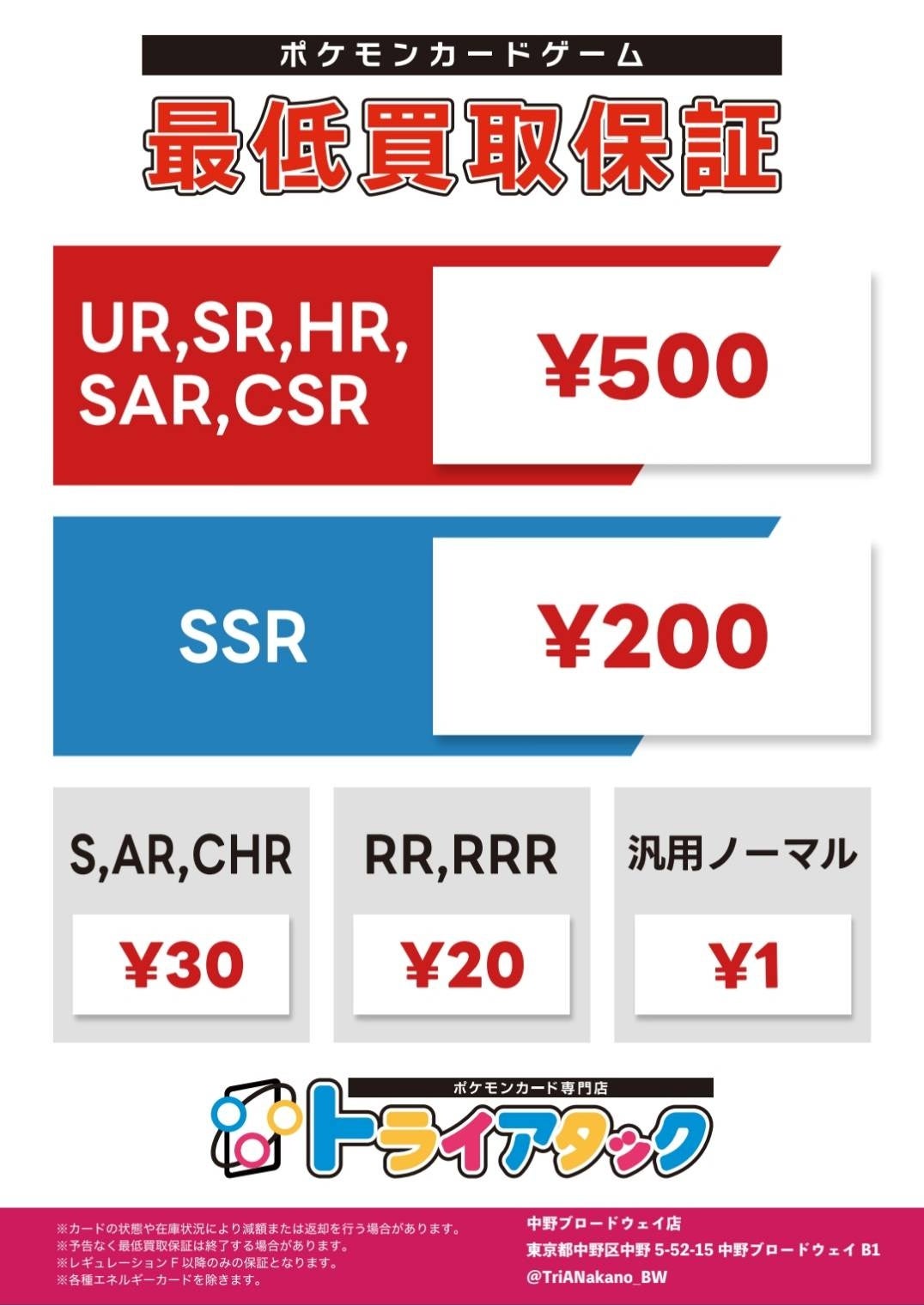 トライアタック中野ブロードウェイ店では、ポケモンカードの買取や、ワンピースカードの買取(ボックスのみ)を実施しています。詳細はお問い合わせください。