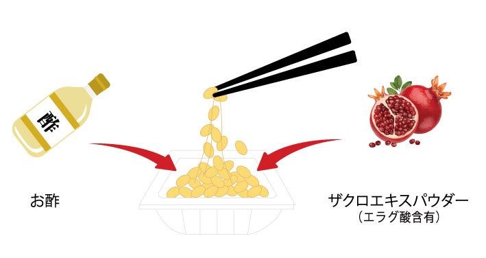 納豆の本来の素材に健康を意識した【お酢】と機能性関与成分を含んだ【ザクロエキスパウダー(エラグ酸含有)】を加えることで、よりカラダにやさしい納豆に仕上げております。