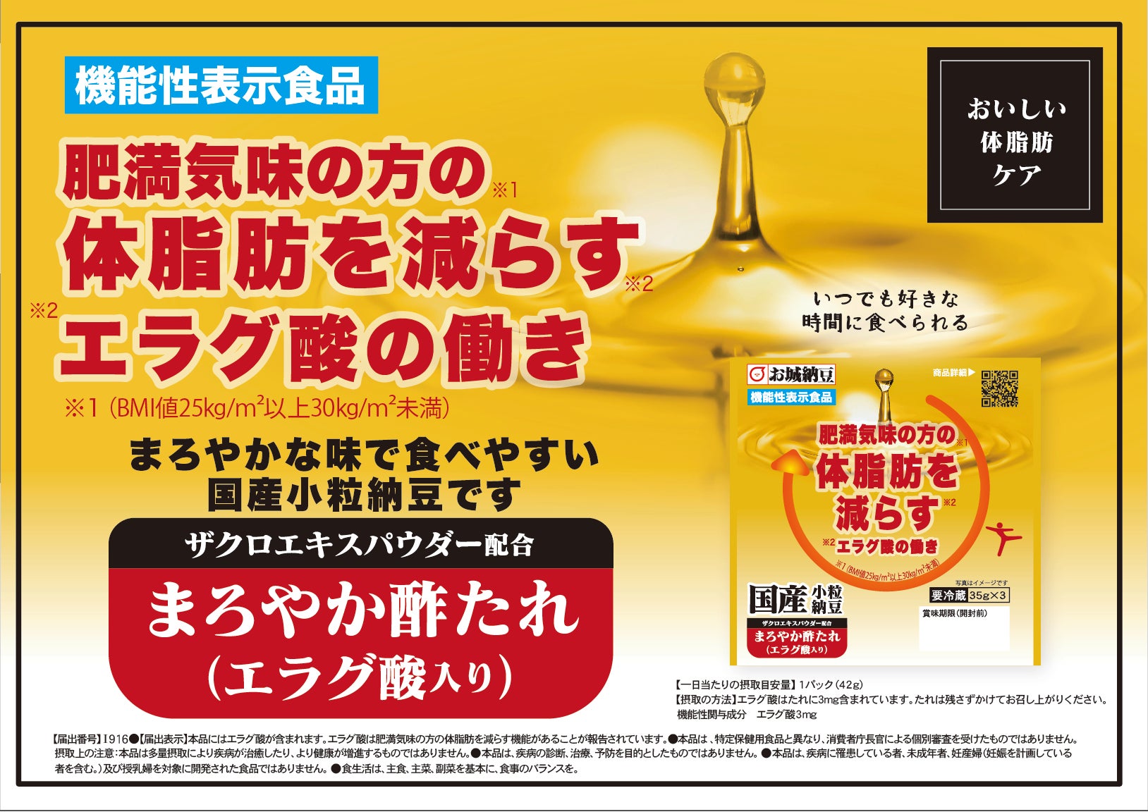 納豆のたれ(まろやか酢たれ)には、機能性関与成分である【エラグ酸3mg】が含まれており、エラグ酸による肥満気味の方の体脂肪を減らす機能がある「機能性表示食品」としては、日本で初めて消費者庁に届出が受理されました。