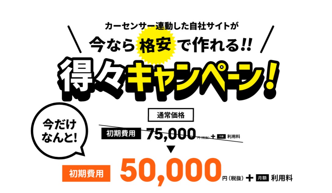 通常のWEB制作会社ではデザインとシステム開発に高額な費用がかかりますが、カーブースNEXTでは自動車事業に必須の機能(物件連動、バックオーダー、買取フォーム、パーツリスト)を含め、初期構築費(※キャンペーン中に限り¥50,000(税別))と月額サービス利用料(※最安プラン¥9,800/月~)のみで圧倒的な低価格を実現。
