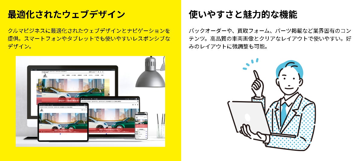 このサービスは、カーセンサーとの物件連動機能が特長であり、中古車販売店の手間を大幅に削減することで、ビジネスオーナーの効率的なWEB運営が期待できます。