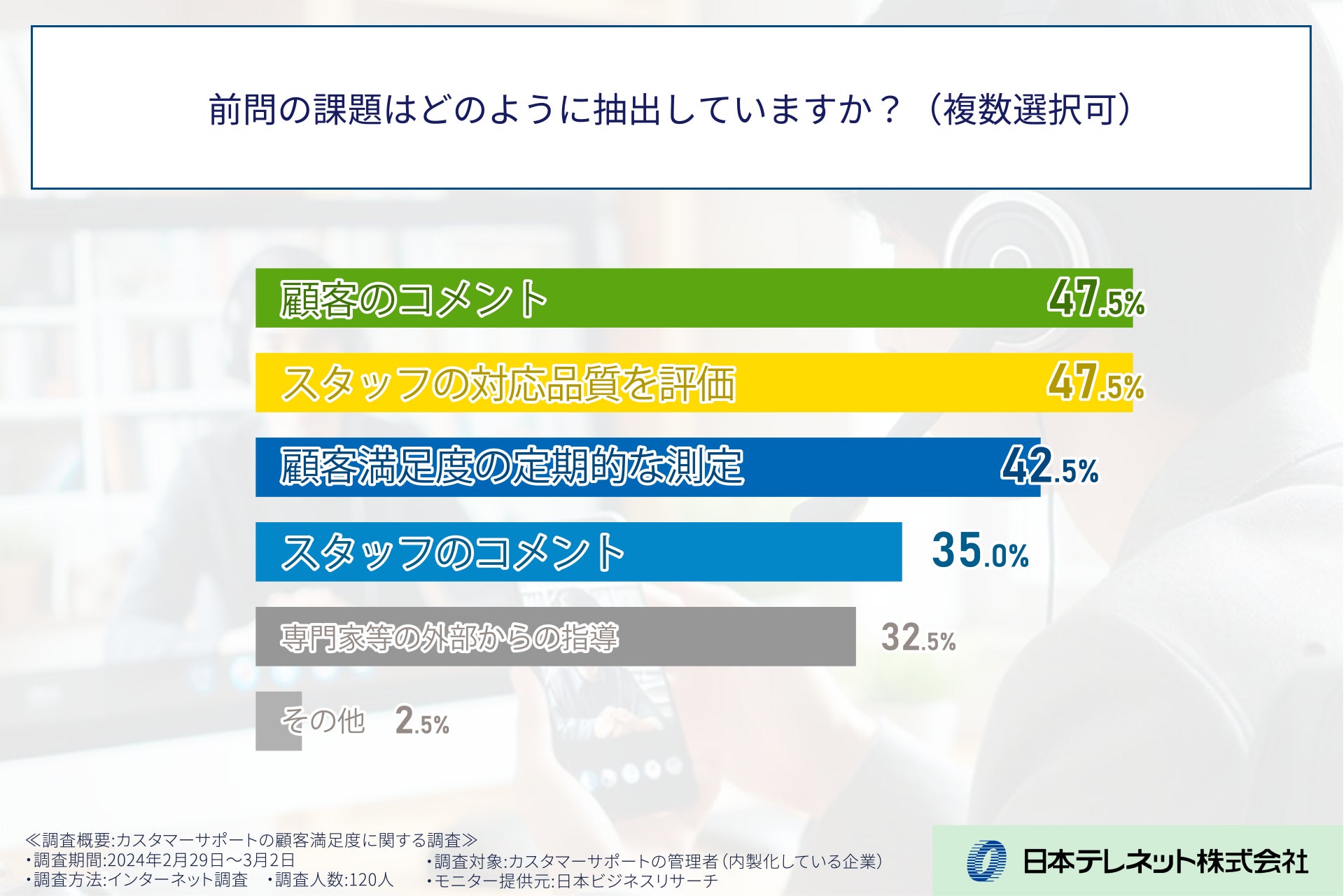 最も多かったのが「顧客のコメント」、「スタッフの対応品質を評価」で、同数の47.5%でしたが、「顧客満足度の定期的な測定」にも多くの票が集まりました。