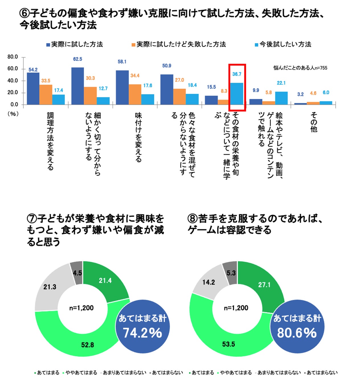 次に、悩んだ経験のある人に対して、その克服に向けて実際に試した方法と、失敗した方法、そして今後試したい方法について聞きました。実際に試した方法としては、「細かく切って分からないようにする」(62.5%)、「味付けを変える」(58.1%)、「調理法を変える」(54.2%)がトップ3に入りましたが、、 「味付けを変える」 (34.4%)、 「調理法を変える」(33.5%)、 「細かく切って分からないようにする」(30.3%)において実際に試したけど失敗したと感じている方も多いことが分かりました。それに対して、今後試したい方法としては、「その食材の栄養や旬などについて一緒に学ぶ」(36.7%)や「絵本やテレビ、動画、ゲームなどのコンテンツで触れる」(22.1%)が上位に入りました。このことから、調理方法の変更や料理の工夫ではなく、別の方法で子どもの偏食や食わず嫌いにアプローチすることを検討しているのではないかと推測されます。(⑥)