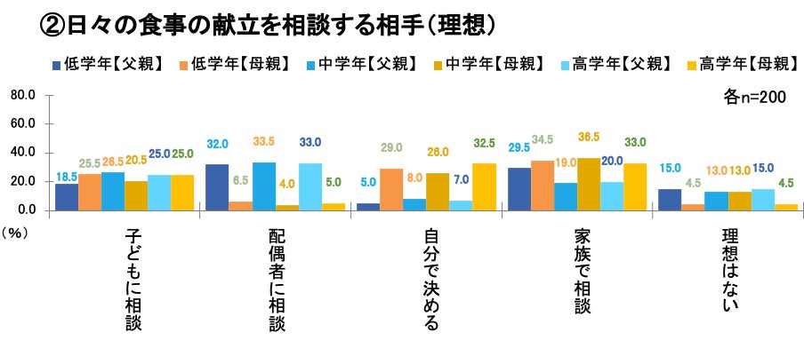 続いて、理想についても尋ねたところ、母親の理想は子どもの学齢に関わらず、「家族で相談」がトップで、次いで「自分で決める」でした。一方、父親の理想は「配偶者に相談」がトップとなり、母親の意見を聞くことを重視する結果となりました。(②)