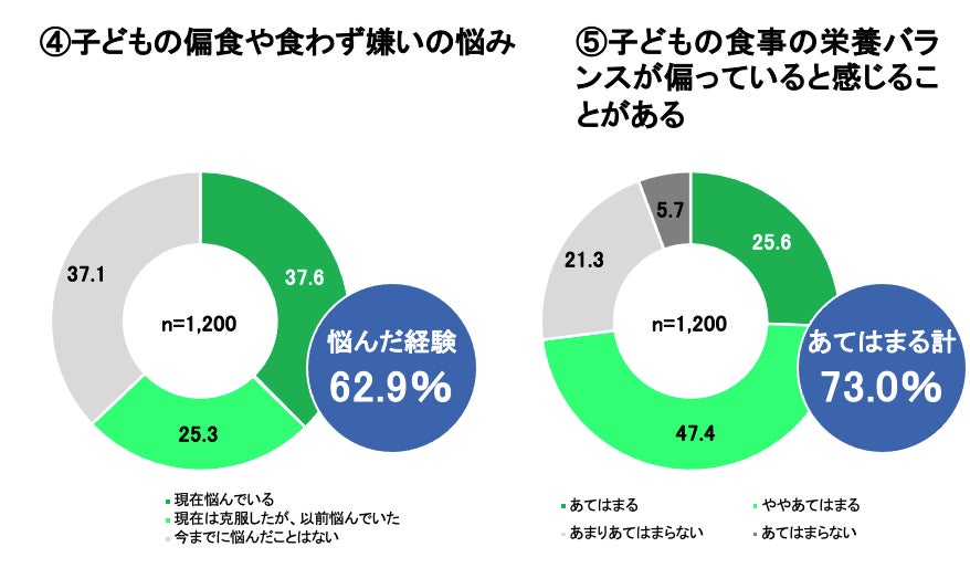 続いて、子どもの偏食や食わず嫌いについて聞いたところ、6割を超える親が子どもの偏食に悩んだ経験があることが判明し(④)、さらに子どもの栄養バランスが偏っていると感じた経験について聞いたところ、73.0%の親が「あてはまる」と回答しました。(⑤)