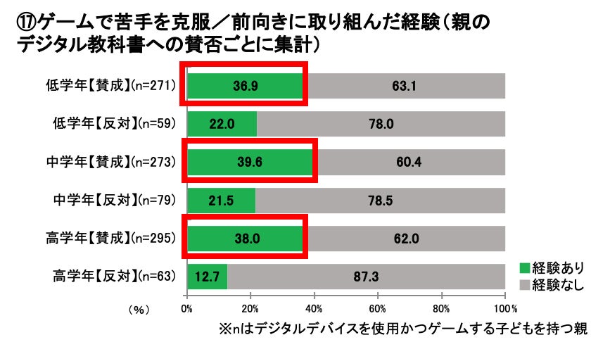 さらにこの「苦手を克服したり、前向きに取り組むようになった経験」の有無と「親のデジタル教科書への賛否」別に分析したところ、それぞれの学齢においていずれもデジタル教科書に賛成している親の方がゲームによって子どもが苦手を克服/前向きに取り組んだ経験があることが分かりました。デジタルデバイスを用いた成功体験に何かしらの影響を与えていることが推測されます。(⑰)