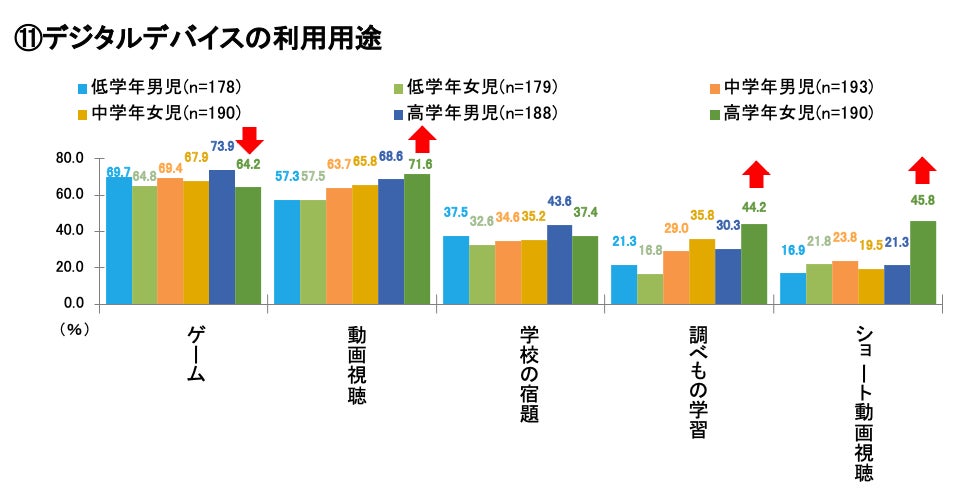また小学校低学年、中学年、高学年別に利用用途についてみてみると、全体では「ゲーム」(68.3%)、「動画視聴」(64.2%)、「学校の宿題」(37.5%)の順で多い結果となりましたが、、高学年女児は「動画視聴」(71.6%)、「ゲーム」(64.2%)、「ショート動画視聴」(45.8%)と、他の年代と比べて特長があることが分かりました。(⑪)