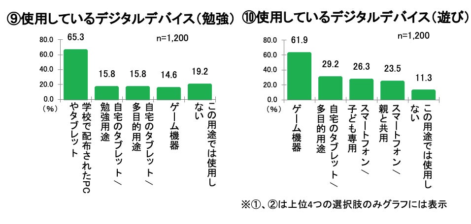 ここからは子どもが使用するデジタルデバイスの利用について聞きました。勉強用途では「学校で配布されたPCやタブレット」(65.3%)、「自宅のタブレット(勉強用途のみ使用可能)」、「自宅のタブレット(多目的用途で使用可能)」(同率15.8%)と、勉強にはタブレットを活用することが分かりました。(⑨)一方、遊び用途では、「ゲーム機器」(61.9%)、「自宅のタブレット(多目的用途で使用可能) 」(29.2%)、「スマートフォン(子ども専用)」(26.3%)の順で高い結果となり、用途に応じてデジタルデバイスを使用していることがわかりました。(⑩)