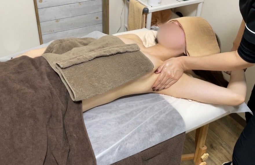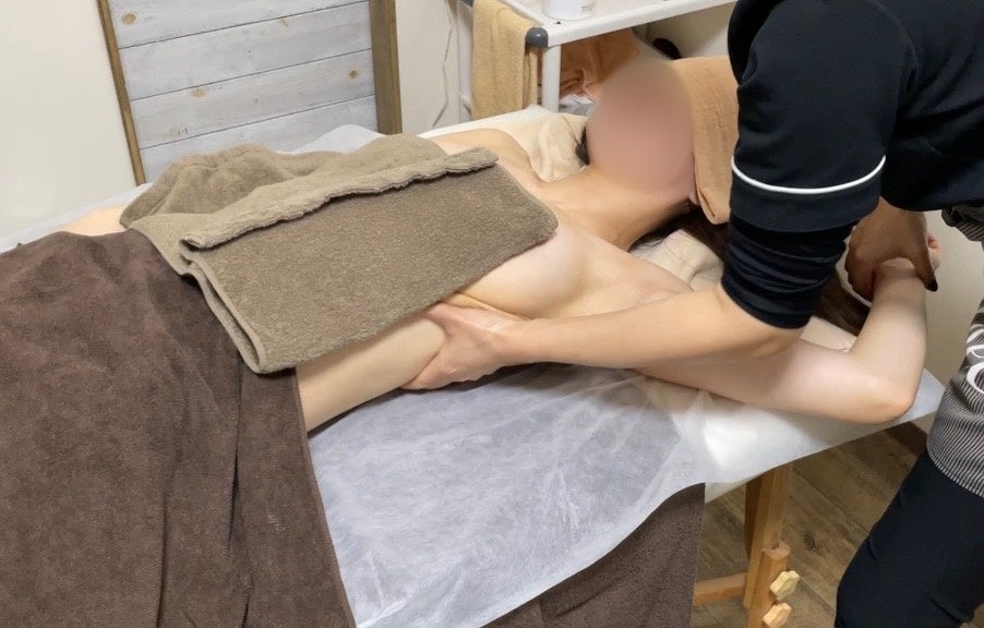 バストケアトリートメントでは、ハンドで肩回り、背中、ウエスト部分をほぐしながら