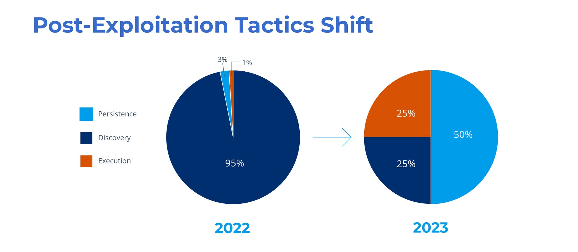 持続性戦術は2022年の3%から50%の急増を示し、それに発見(約25%)と実行(残りの約25%)が続きます。脅威アクターによって使用される観察されたコマンドのほとんどは一般的なLinuxシステムを対象としていますが、広く使用されているルーターに搭載されたネットワークオペレーティングシステム用に実行される特定のコマンドに関する顕著な傾向があります。