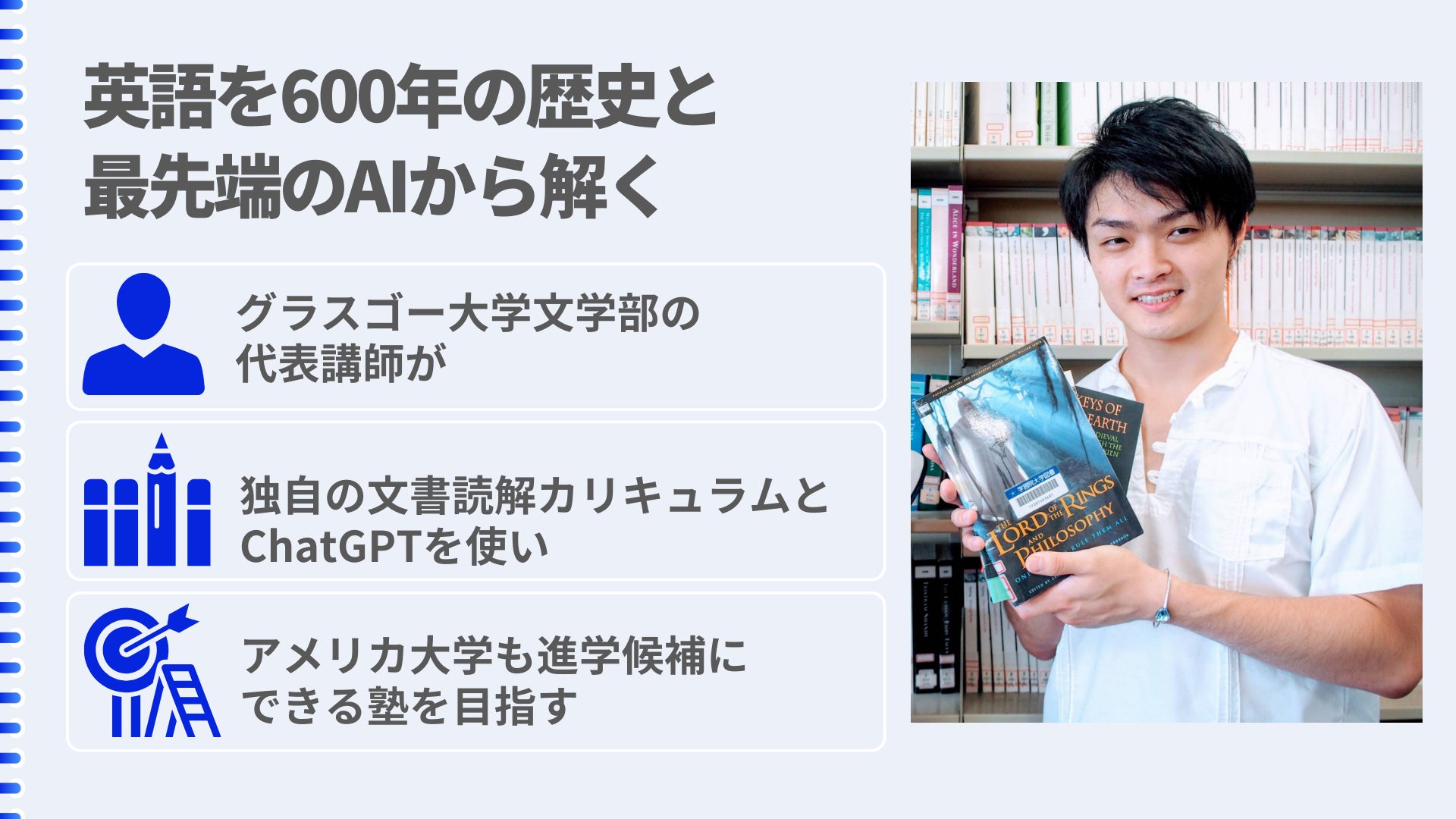 ミニスタッド代表の草野は、幼少期の10年以上をアメリカで過ごしました。その後、600年の歴史があるグラスゴー大学の文学部へ留学をしました。帰国後、草野は個人指導で数多くの学生をアメリカの大学へ進学させる手伝いをしていました。その彼の文章読解メソッドを体系化し、AI(ChatGPT)で強化することで、塾として開業することを決意しました。