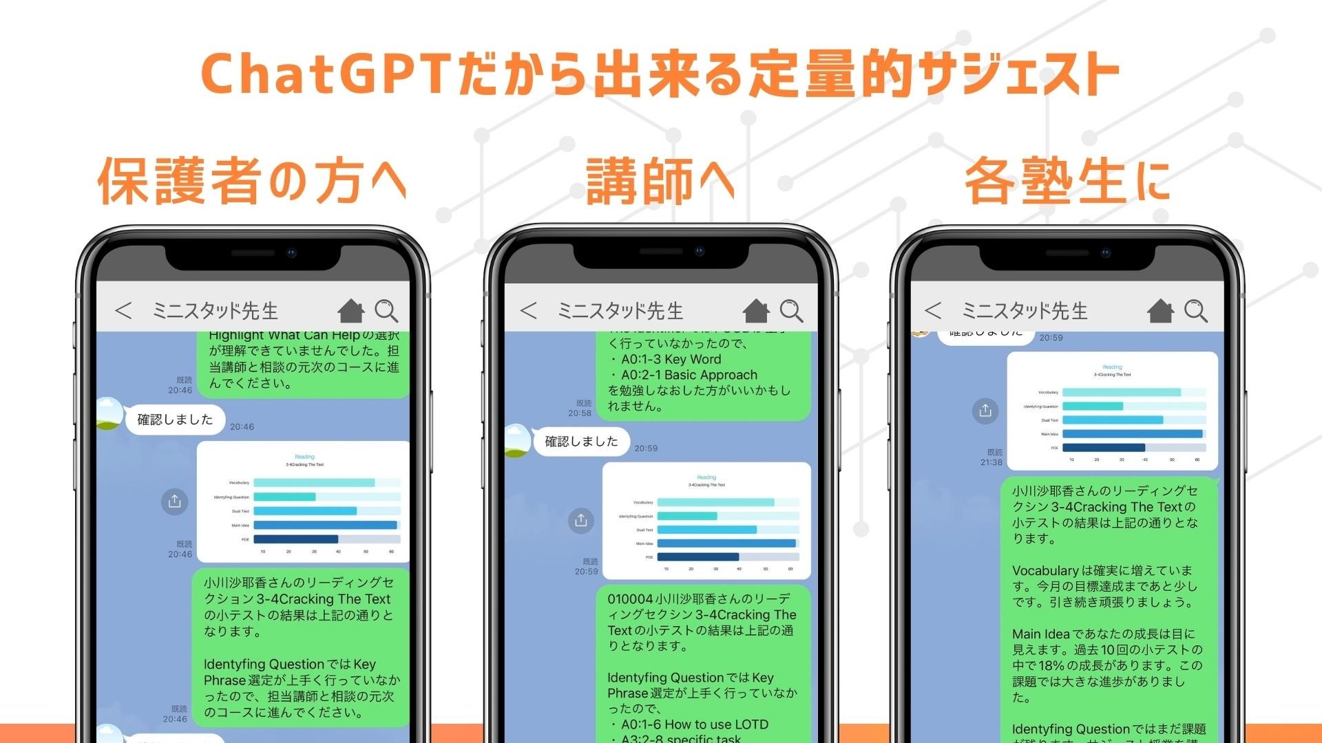 ミニスタッドでは、ChatGPTを進捗の管理に使います。塾での毎回の小テストにおいて、生徒が理解できてない場所をChatGPTにより分析し、それを担当講師と保護者に共有します。その共有されたデータをもとに、不足部分を補うような宿題を出し、モチベーションを高めます。