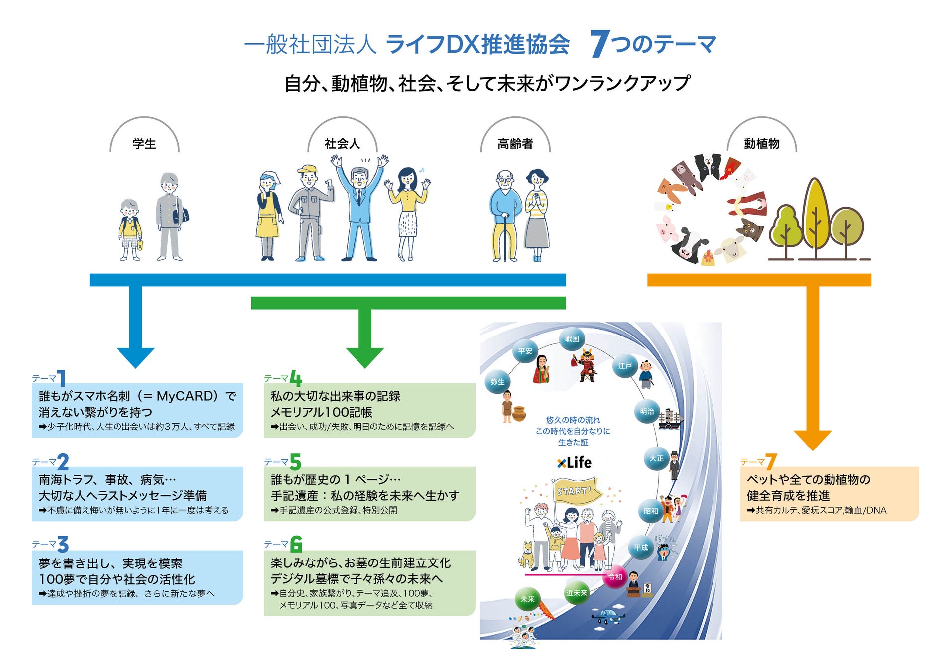 本協会は生涯において必要かつ大切なこと、繋がり(人や動植物)、重要で記憶すべき出来事、夢や目標、不慮に備えた終活、未来へ繋ぐ手記、お墓(デジタル墓標)生前建立など7つの視点から総合的にライフDXを推進してまいります。