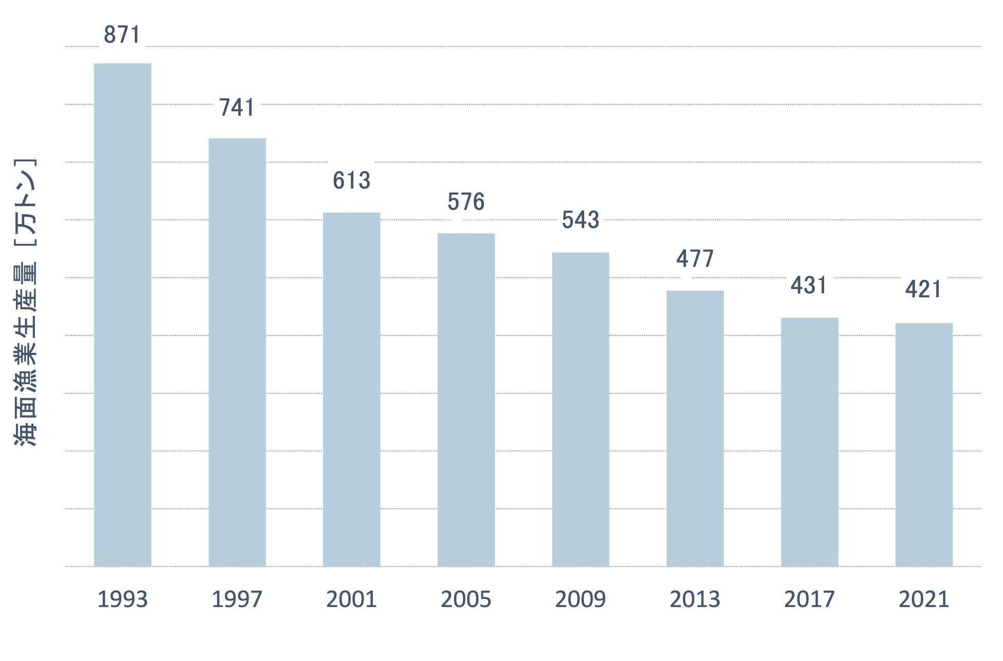 農林水産省の報告によると,近年日本の海面漁業(漁業および養殖業を含む)の生産量は過去30年で半減しています。(※1)
