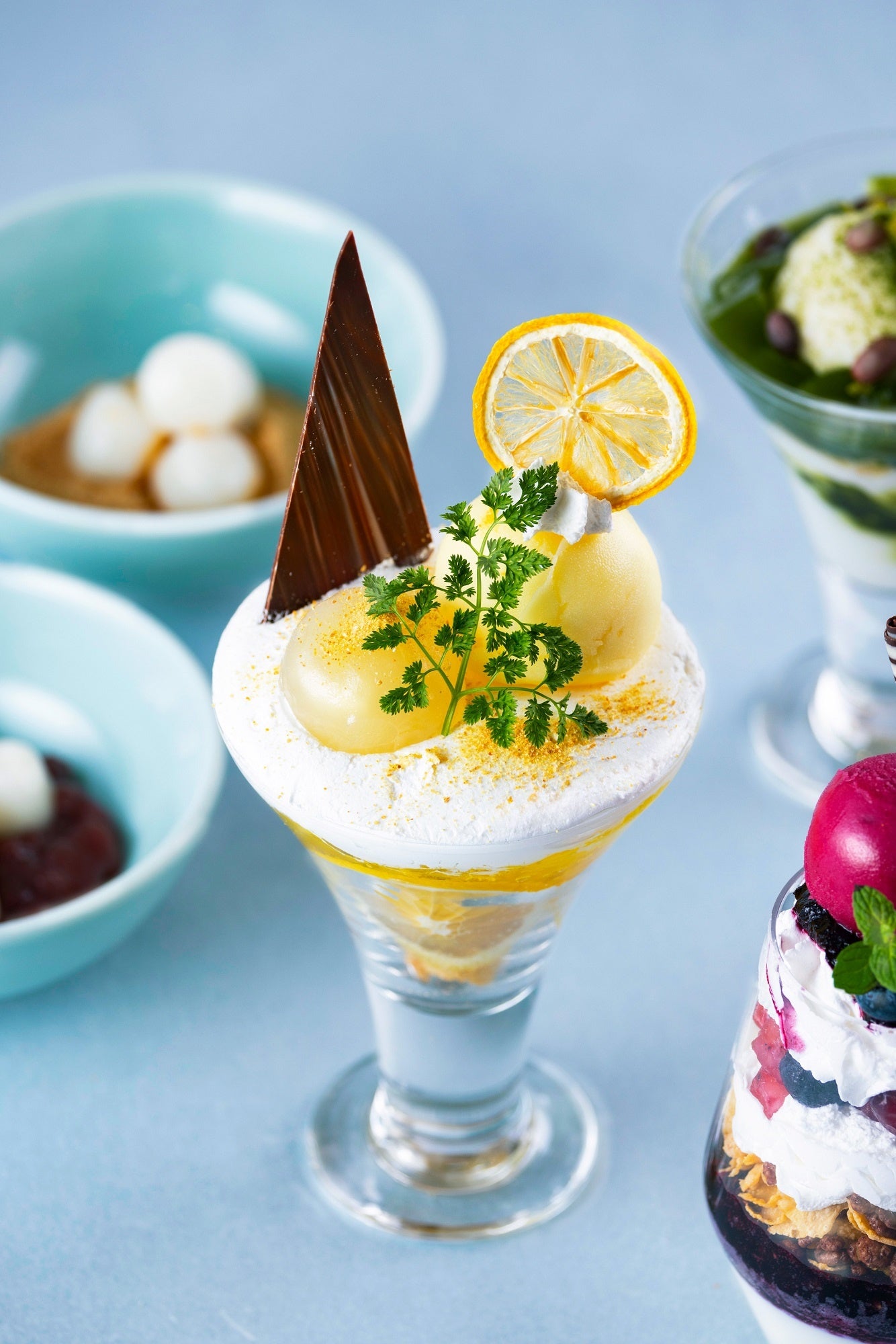 レモンだけでなく、日向夏や柚子といった他の柑橘系果実のテイストも加えたシェフこだわりの新作パフェです。爽やかな夏の味覚を存分にご堪能頂けます。